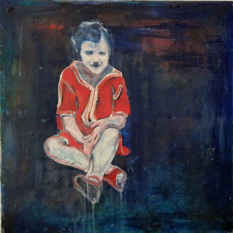 Image of a girl wearing red on the background of a blue sea. Based on childhood memeories, happiness and fun.