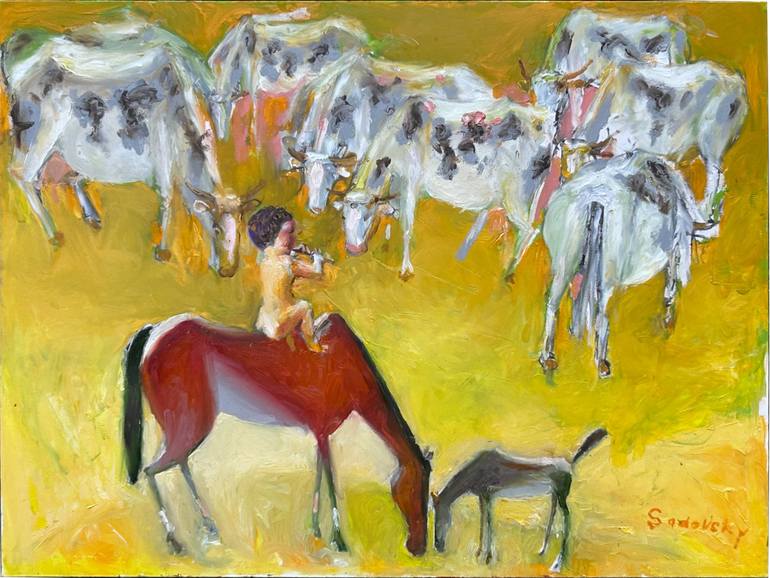 Painted in soft, bright tones, "Little Shepherd" captures a tranquil scene with a young shepherd boy playing the flute while seated on a horse, accompanied by a small foal. In the serene background, light-colored cows graze peacefully. The simplicity and pleasing color palette make this artwork an i...