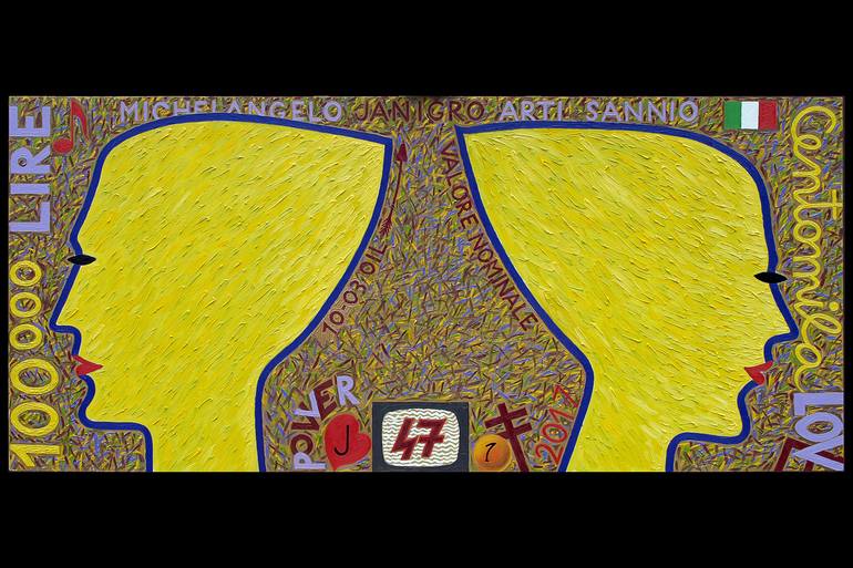 The work is inspired by the series of small watercolors, which I realized between 1995 and 1997; They were a free and ironic interpretation of 100,000 lire banknotes in Italy. The banknotes gave me the chance to overcome the concept, often of a manier style ....