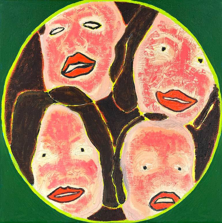 This is the next painting in the series Constellations. Crowded people are looking at the viewer. Four people. It's hard to guess what their mood is. I think they are looking for something, they desire something. Maybe they are surprised or they want to shout through their half-open mouths. The blac...