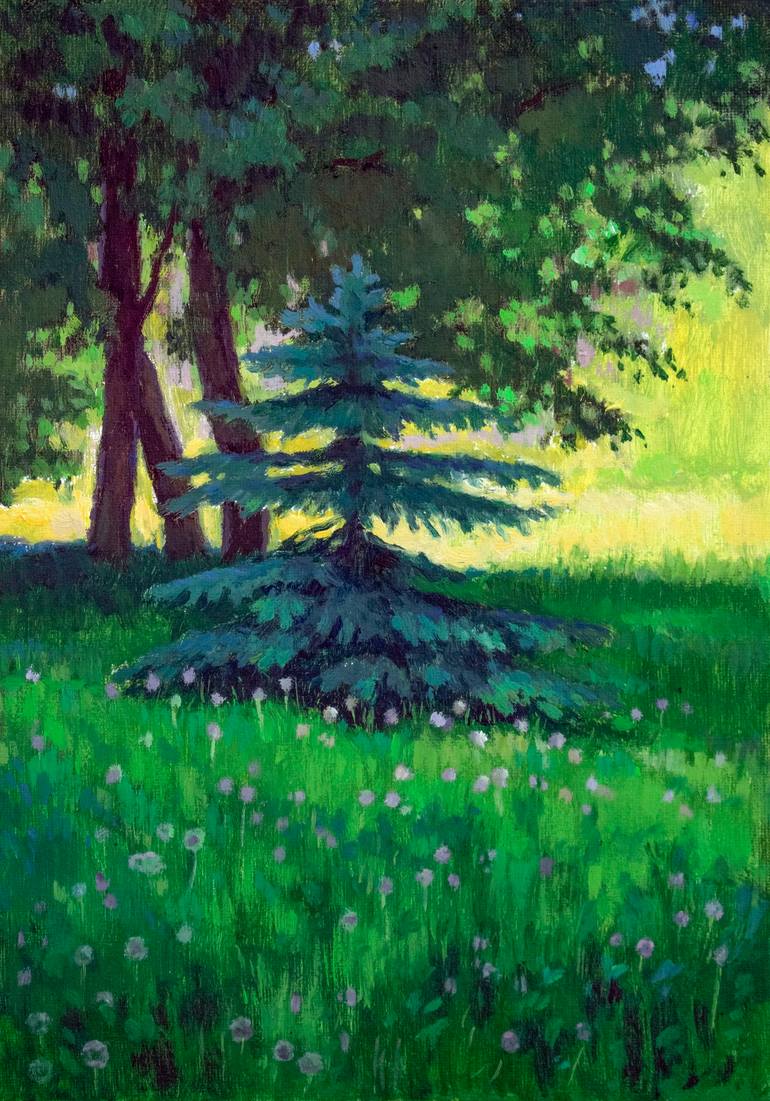 This painting transports us to a serene and tranquil corner of nature. In the foreground, a young spruce stands out, surrounded by a lush green meadow dotted with small flowers and dandelions. The deep green shades of the spruce’s needles contrast beautifully with the vibrant and rich greens of the ...
