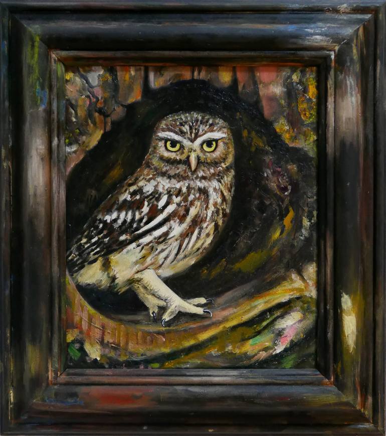 The little owl looks back at the viewer of this artwork, as if to say: What are you actually doning? The wooden frame is also painted with oil and is part of the artwork The work is signed on the back and hanging hardware is included. My inspiration is to focus more on the parallel universum Natu...