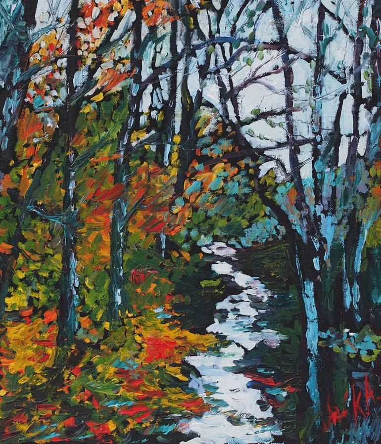 Fall has always been my favorite season. The time when everything bursts with its last beauty, as if nature had been saving up all year for the grand finale. Title: Little river in the autumn forest Oil painting, Canvas on board Cm: 30w/35h/0.2d Inch: 11.8w/13.8h/0.1d unframed * This artwork is s...