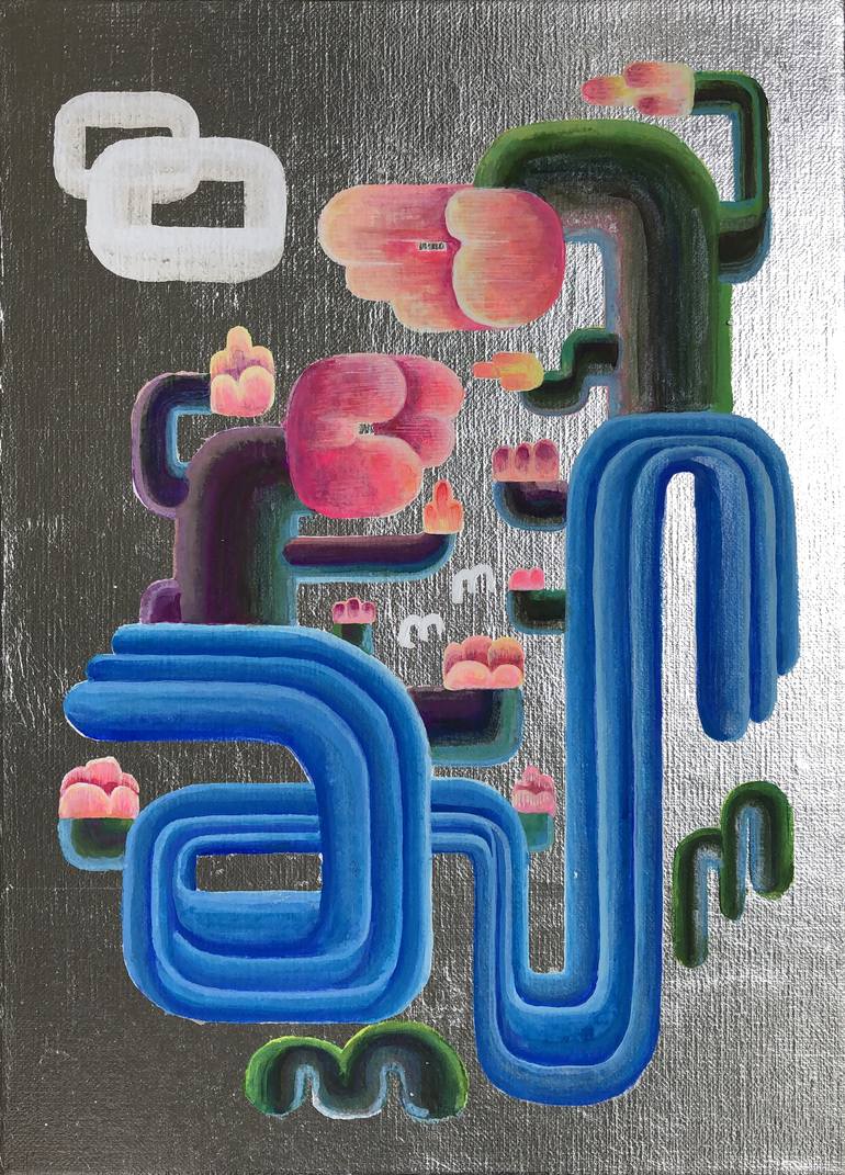 New concept of landscape painting. Acrylic with silver leaf on linen canvas.