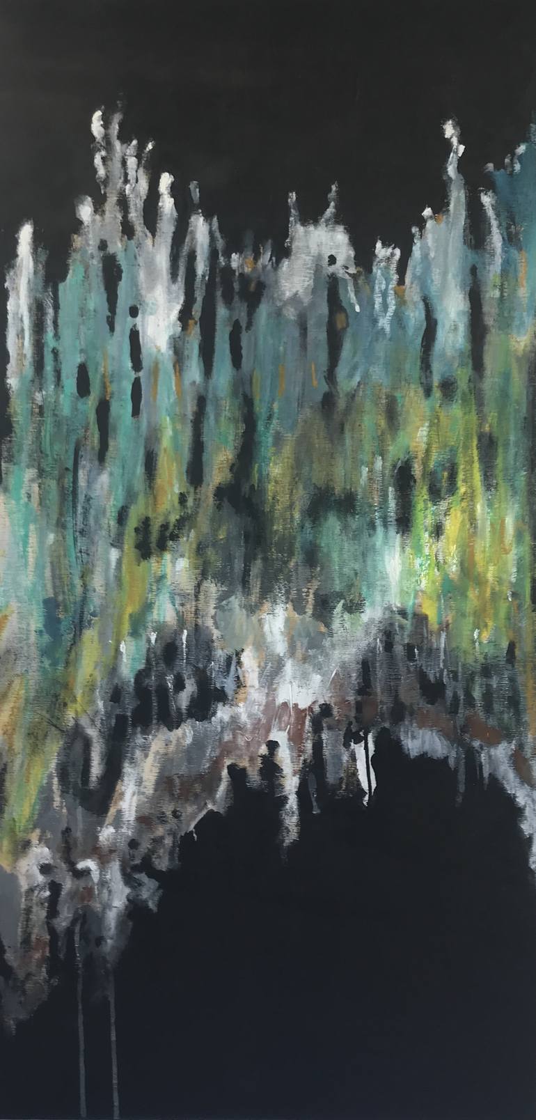 Like layers of a tree these new works play colourfully from ground to sky like our flight through life from beginning to end in no particular form. Using exaggerated elongated strokes, which was intense as I painted the series together, changing the palate for each.. the base and the top are black g...