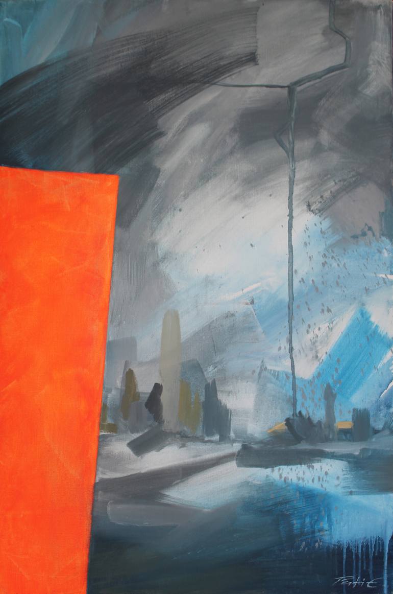 I was born on 25th May 1990, in Subotica, Serbia. I got my degree in Visual Arts in 2013, at the University of Szeged, in Hungary. Now I live and work in my hometown. Although my painting is highly abstracted, one may discover worlds in the details – the sun, the moon, rivers and lakes, skies, dust in the clouds, windows on houses. During my studies I started to enjoy painting landscapes. At the beginning these were classical landscapes with realistic approach and color palette, but over time the compositions became more and more abstract. The topic is of a secondary importance to me; while I paint, I mostly deal with creating the balance and the composition. One of the pillars of my painting is the planned, controlled randomness, the conscious placement of gestures that, according to compositional aspects, may seem accidental on the canvas. While consciously building up the composition, I pursue to paint instinctively with full freedom. I seek harmony between the constructive, the geometric, and the expressive, the chaotic. Despite the placement of each geometric shape on the canvas being in contrast with the surrounding sweeping brush strokes and paint dribblings, a sense of harmony and calmness emerge in the restless reality. I want to wake up the viewers’ minds. I want to encourage them to step out of their comfort zone, to look for new details, motifs, that might have remained undiscovered even for me during the creative process; to be not just a viewer, but to be an active part of the art, to be inside of the painting, a resident of my world.