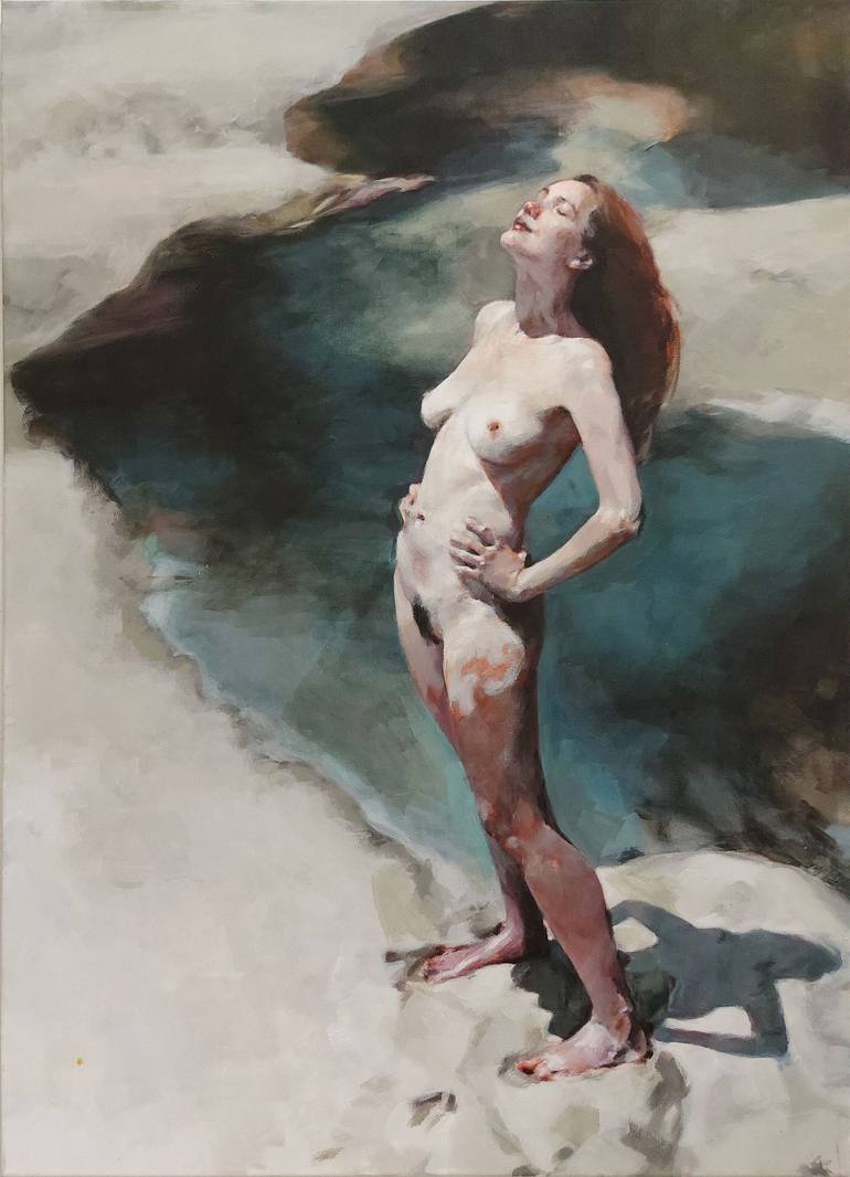 Born in Cagliari, Italy, in 1970. Lives and works in Rome. "A painter is like the sea, it can’t but reflect the Sky" My painting investigates the human figure in relation to the natural environment, focusing on the revelatory quality of this bond through a figurative language that integrates elements of structural tension and dynamic suspension. In my vision, the nude figure is an expression of integrity and individual freedom – a subject that, unburdened by veils or filters, represents the active conquest of one’s own state of being, detached from conditioning and self-censorship. The figures are immersed in natural contexts that vibrate with energy, spaces that host moments of intense manifestation where the scenery acquires an enigmatic and elusive aura, suggesting the realization of something invisible. The work explores the dialectic between the concreteness of paint and the power of the unsaid, placing itself in a dialogue between sensory realism and dreamlike suggestion.