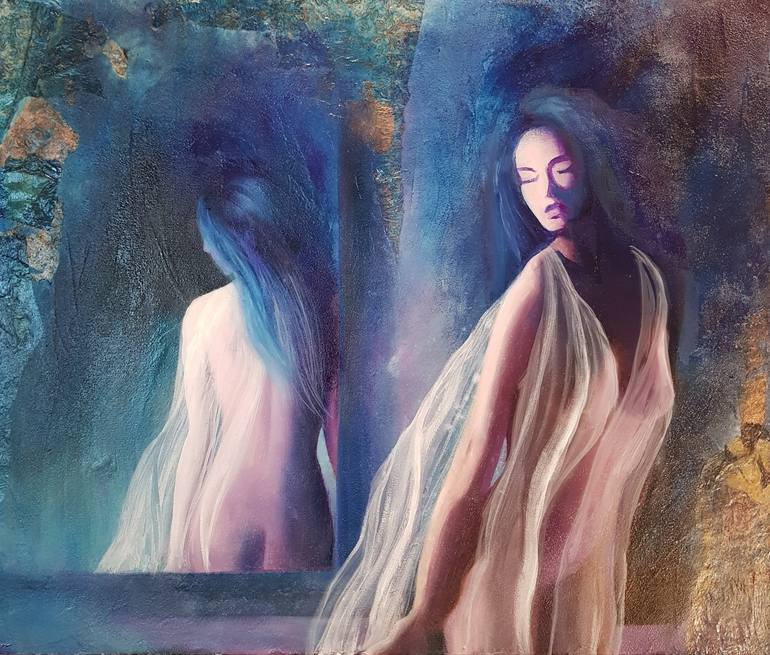Mixed media on canvas, textured background, water and oil colors with the addition of tissue paper, gold leaf and fabrics. Mixed media on canvas, textured background, water and oil colors. The female body rests on an abstract background and represents the idea of "Eternal Feminine": woman is a symb...