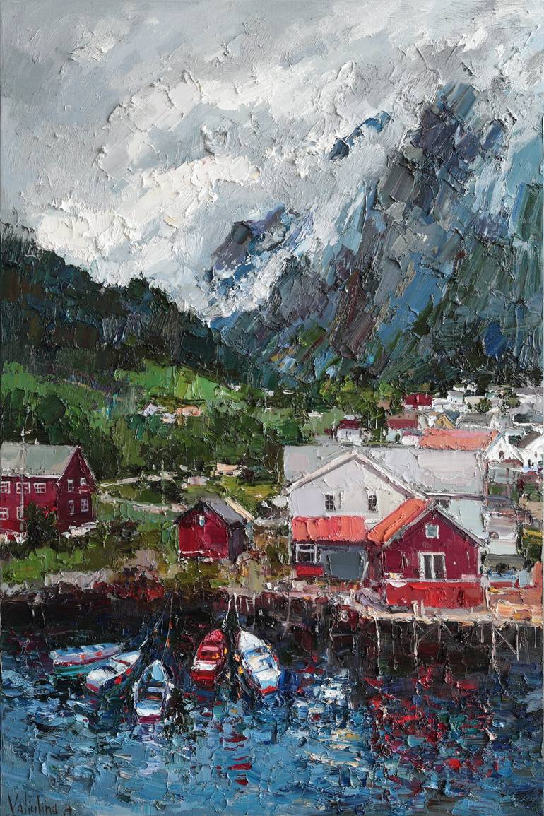 This original oil painting captures the tranquil beauty of Norway’s Lofoten Islands. The composition includes a quaint coastal village with colorful boats, vibrant red cabins, and towering mountains under a moody sky.