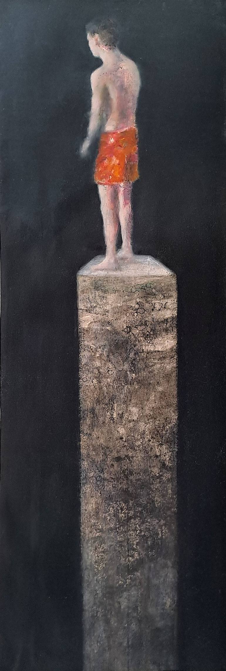 A young man, in a fragile position on a huge piedestal,looking for something in the night, maybe for an answer?