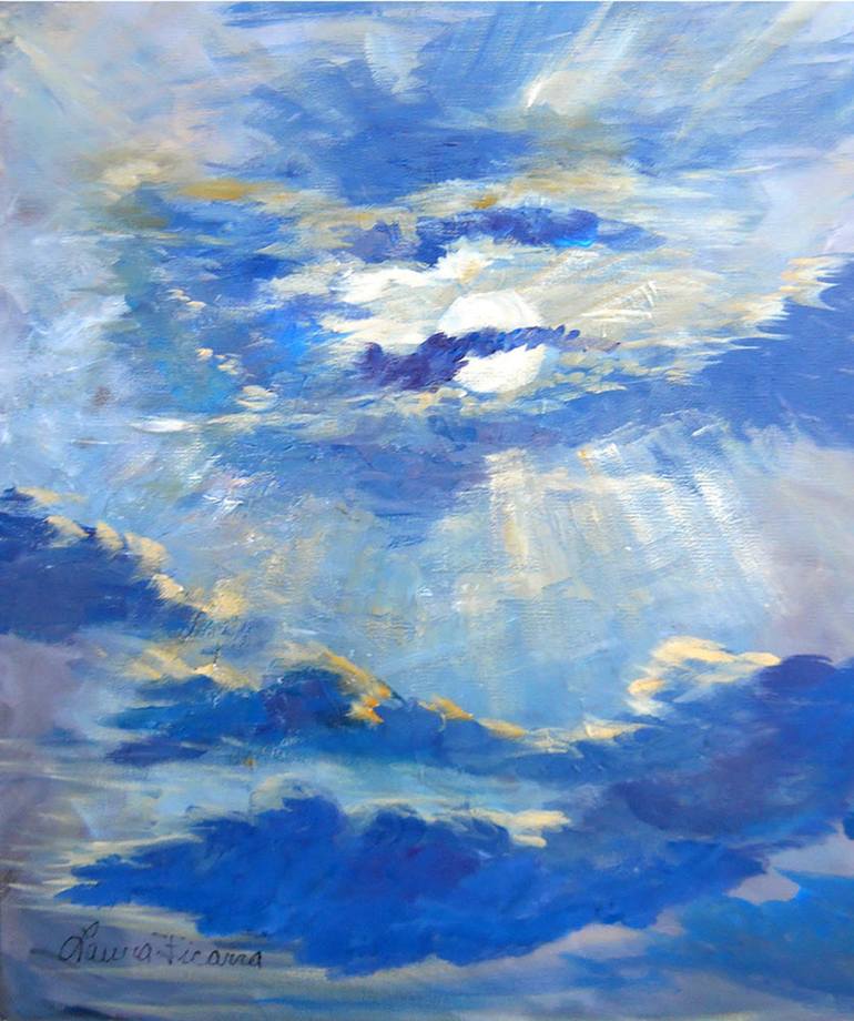 Claude Monet inspired this painting. I hope the viewer feels the peacefulness and hopefulness that comes from the sun breaking open through the clouds. This painting was inspired by the actual sky in London on a hot summer afternoon. The cloud filled sky was suddenly interrupted by the sun's rays...