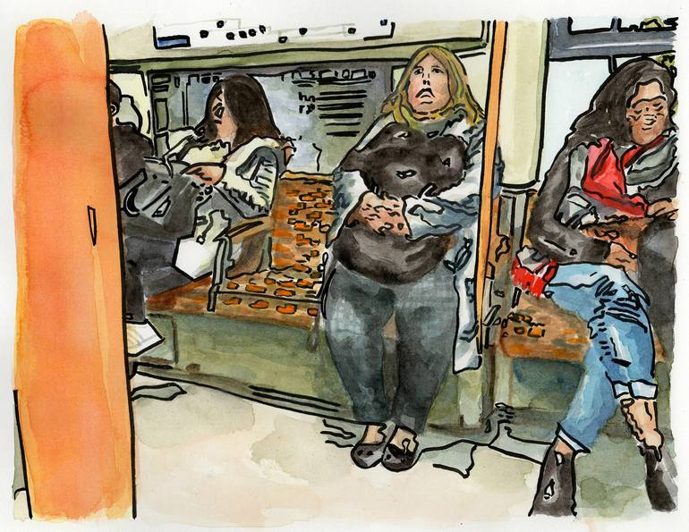 This painting is created in indian ink and watercolour paints and is about a train journey that I took on the London Underground from Clapham Junction to Shoreditch High Street. This artwork focuses on the behaviour of commuters and the related health issues of city workers.
