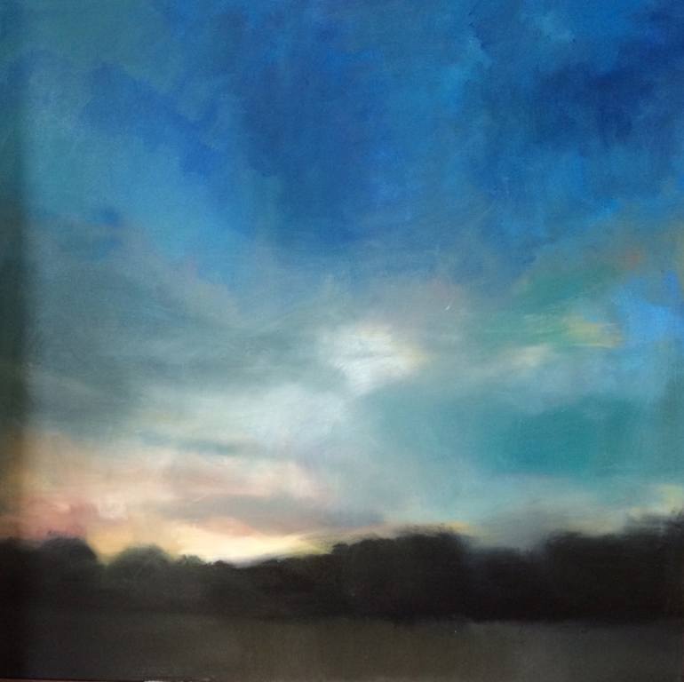 A semi-abstract painting of the sky in Summer. Painted on 100% primed cotton canvas with Michael Harding Artists Oil colours, it is a large canvas measuring 100 x 100 cm, the edges are painted white and it is designed to be displayed unframed.