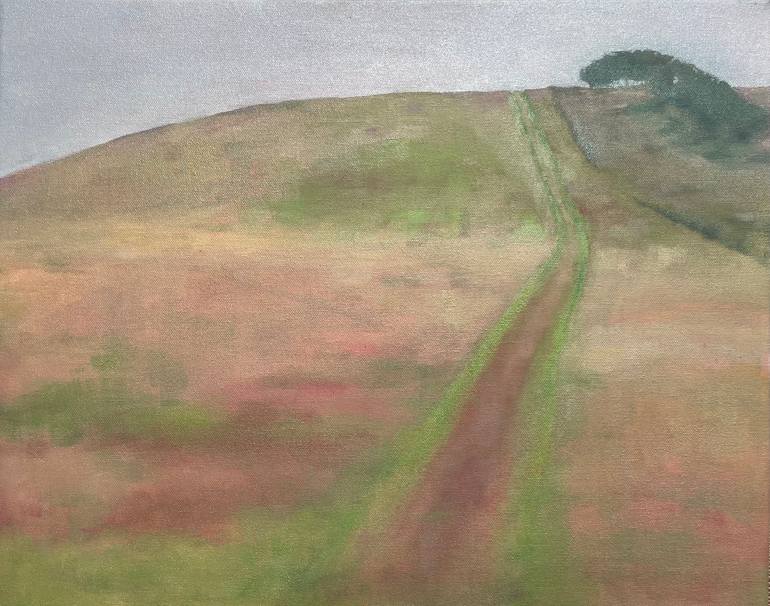 Impressionistic view painted 'plein air' on a Welsh hillside. A steep slope leads to the top of a hill, crowned by a small low lying copse of trees. Tractor tracks guide the eye from the foreground to the crest of the copse. The pink tones of the wild grasses shimmer in the heat, after summer rain ...
