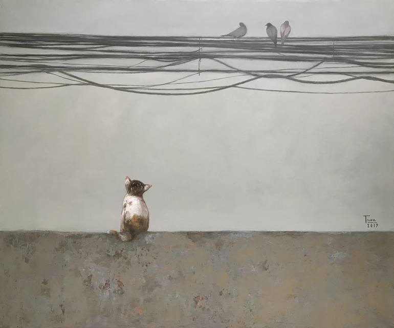 A long day had passed in an extraordinary peace. The cat sat on the wall watching the distant sky and above the birds resting on the rope resting after a tiring flight period.