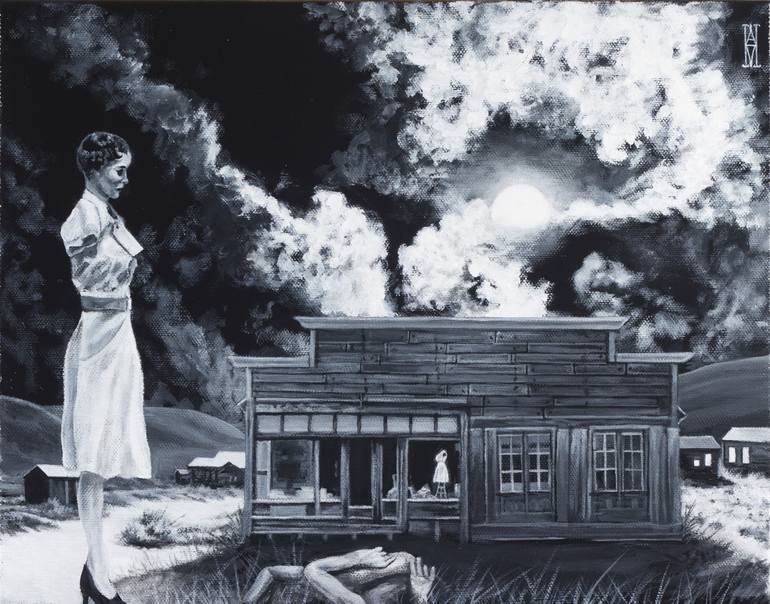 An arm-less mannequin gazes down on a pile of limbs as the moon rises above an old western frontier town. Exhibited as part of "7Saloons 3Brothels 1PostOffice" in October 2015 at 111 Minna Gallery in San Francisco.