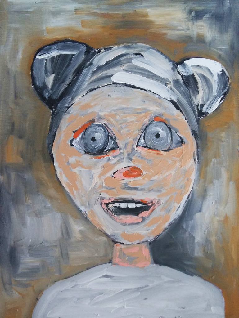 Bitter-ridiculous image about feeelings we can have when we are looking at ourselves, not necessarily in the surface and face. The most horrified we can be of who we are. Acrylic Painting on Plywood, Signed.