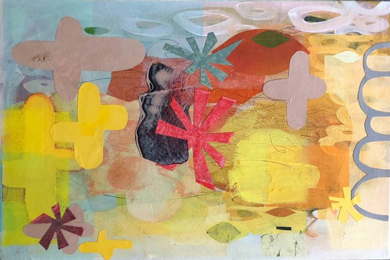 This abstract acrylic collage painting is inspired by seasonal changes in light. At summer's end, but still sunny and warm, the light is not diffused with humidity and begins to get clear, more blue, and reflect colors in a vibrant way. The abstract, quickly elements and shapes in this piece are a j...