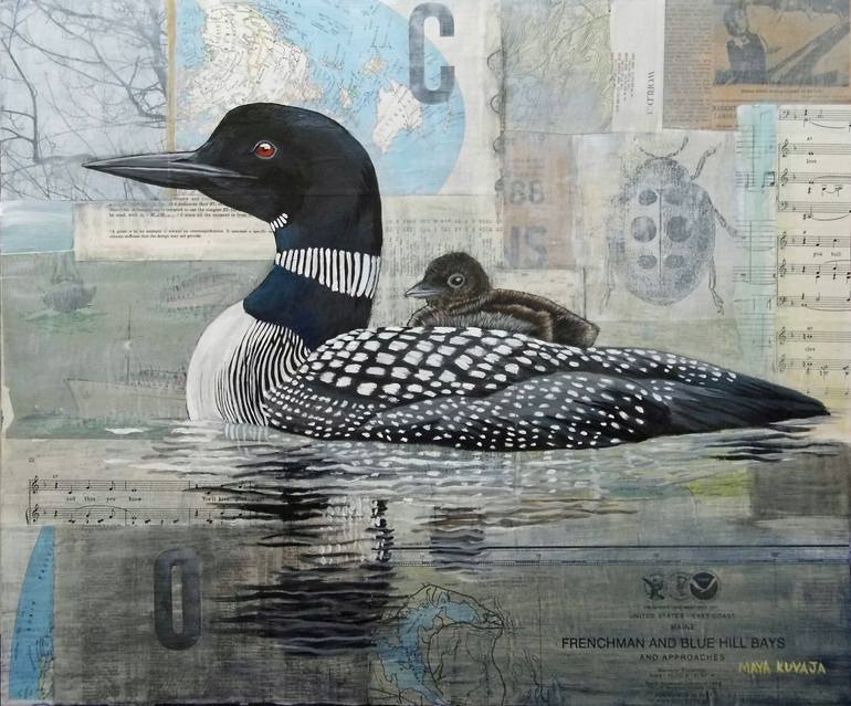 Common loon with chick acrylic painting on a background of vintage paper collage on birch plywood. Edges painted black, varnished and ready to hang.