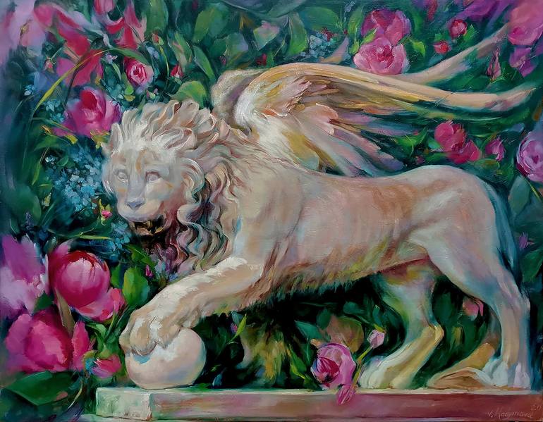 Portrait of a lion. Large , figurative oil on canvas painting. Roses garden with the keeper inspired by Venetians lions. Original fantasy animal painting created in expressionism with rich texture and a lot of palette knife work on warm under painting. Painting is oil on stretched ...