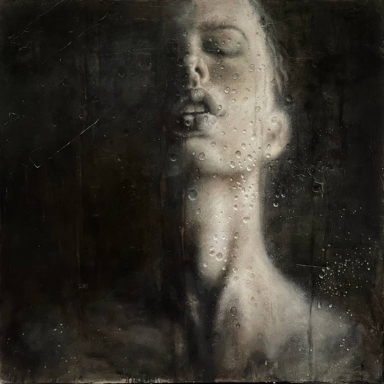 Thin splashes of oils and medium produce a faint figure melting and meshing into the the paint on the panel. She closes her eyes in peaceful resignation…a connection to her sensual self. Oil paint on wood makes a bold and controlled statement. Softening the image and composition choices here…create...