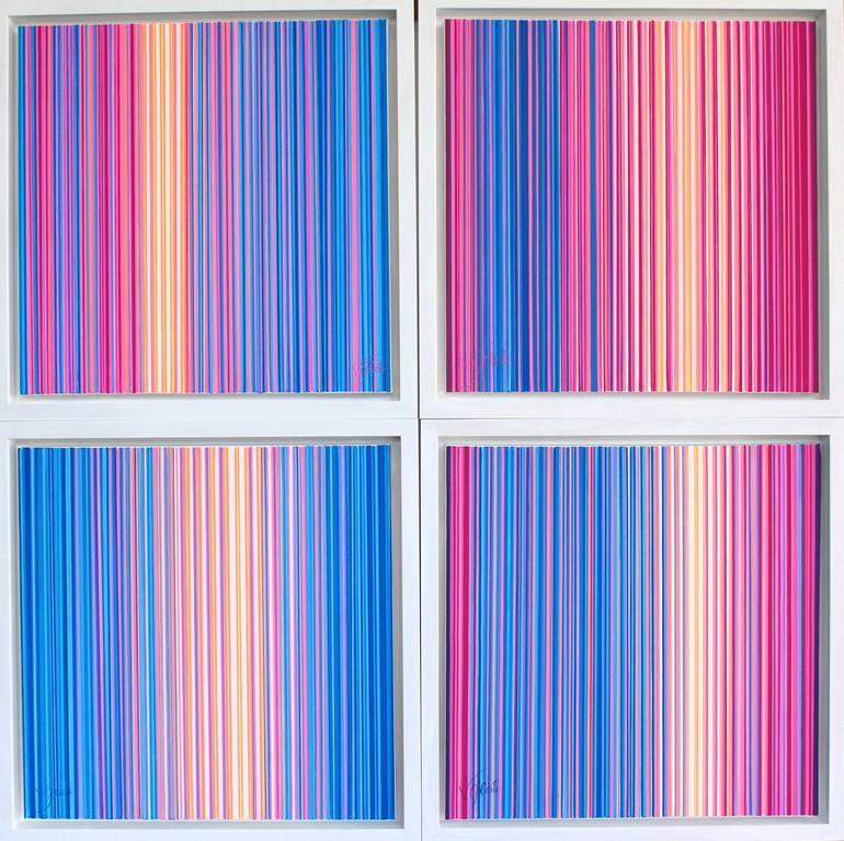 My hand painted works (Música, Verano azul, Felicidad and Che) are inspired by light and vibrant colors as a way of immersing oneself in joy and hope. These paintings are one of a kind and somehow are connected with my wall sculptures -Roble and Carbon Series-. Lines that fall perpendicularly and c...