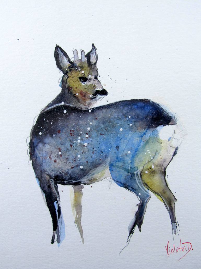 One-of-a-kind, original watercolour painting of a white-tailed deer (Odocoileus virginianus), captured on a snowy day. Painted on Hahnemühle 425 gms (g/m2), professional watercolour paper.