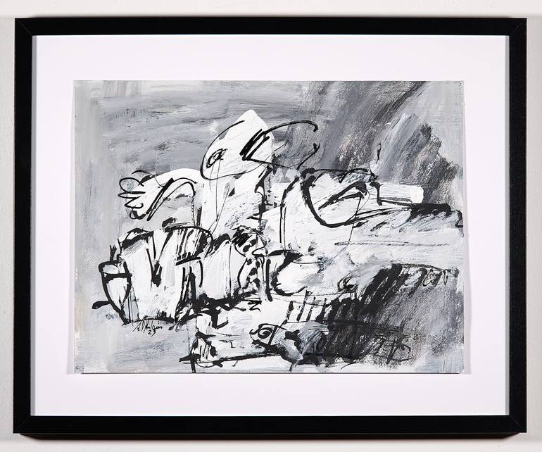 Inks, acrylics and markers on paper, signed on front and back. The painting is framed as shown in the pictures. If available the frame can also be chosen in white or light wood color, and a mount can be applied. If requested it can also be shipped without a frame. With the frame, it will have a fina...