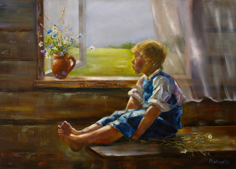"Lost in a Daydream" is a poignant oil painting capturing a young boy gazing through the window of an antique wooden house, his eyes filled with quiet hope. Soft, natural light filters through the window, casting a gentle glow on his face, highlighting his youthful features and the wistful expressio...