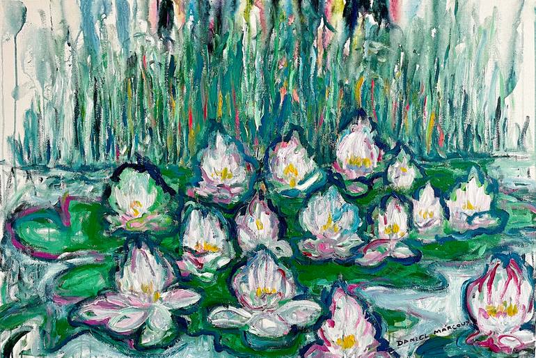 This is my take on the pond’s theme. Lotus flowers are a symbol of spirituality. I see the flowers in the painting as being meditative individuals.