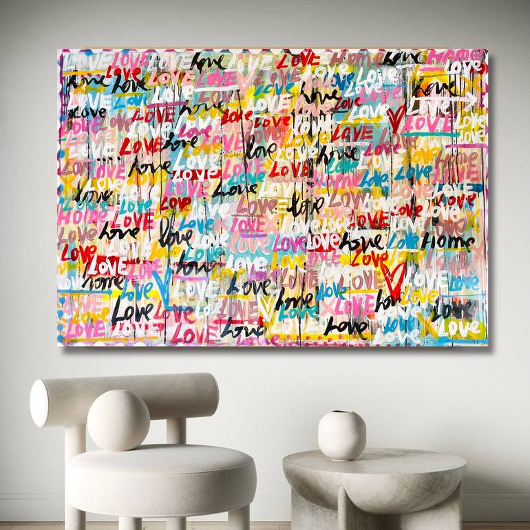 This artwork is an electrifying explosion of color and emotion, dominated by the repeated word "Love" in various styles and hues. The vibrant canvas is a dynamic fusion of reds, blues, yellows, and pinks, creating an energetic and harmonious composition. Its lively presence makes it an ideal cent...