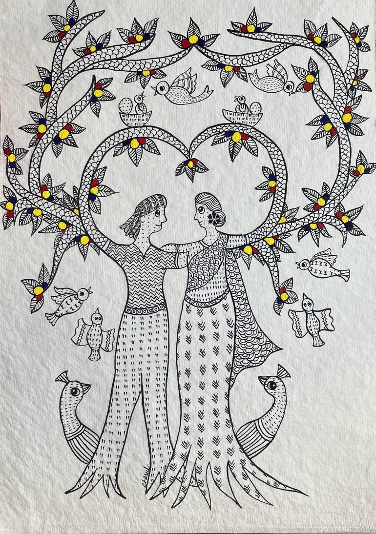Gond (Indian Folkart) painting : In a lush forest, two towering trees stood side by side, deeply in love. They bore countless saplings, scattering them near and far. Yet, their devotion wasn't limited to their own family; it extended to all living beings around. Birds sought refuge in their branches...