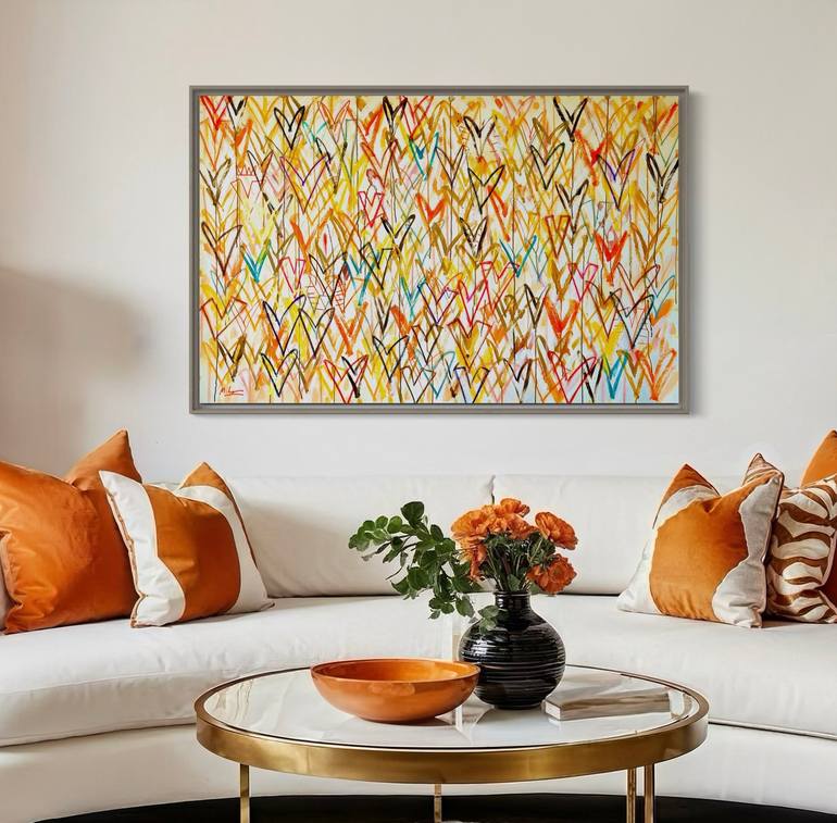 Each heart-like form seems to flutter and dance across the surface, creating a lively and engaging visual rhythm. The overall effect is one of joy and exuberance, making it an irresistible focal point in any space. This artwork exemplifies a masterful blend of abstraction and pattern, engaging viewe...