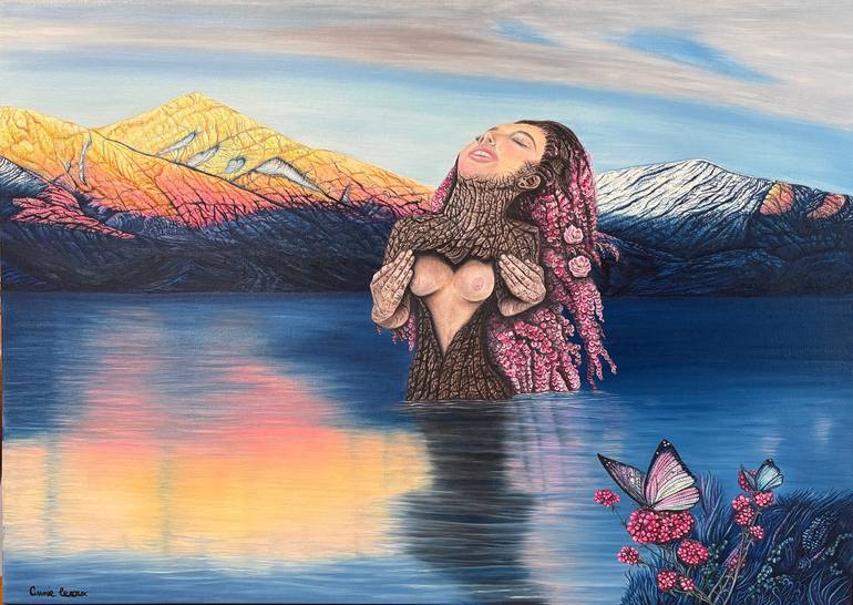 Love Tickles My Heart is a work infused with sensuality, nature, and transformation. A woman, fused with a tree trunk, rises from a serene lake at the foot of glowing mountains lit by the warm colors of sunset. Her body, part bark, part flesh, celebrates the symbiosis between humanity and nature. He...