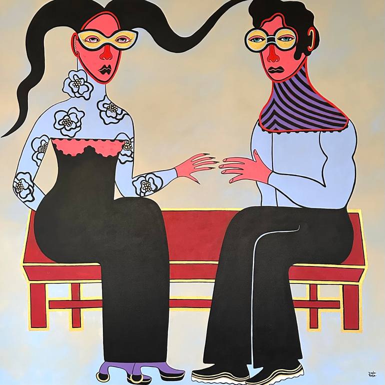 A couple seating in a red bench, ready to hang, new work since November 15, 2024