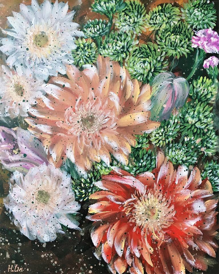 Love is a flower we got to let it grow - Gerbera, Carnation, Pink Lily and Button Pom Green chrysanthemum By HSIN LIN 08/07/2020 40.6 x 50.8 X 1.5 cm Acrylic on Acid free Gesso primed Canvas. Side panels painted Black. D-rings and wire attached at the back. Signed at front and ready to hang. Affir...