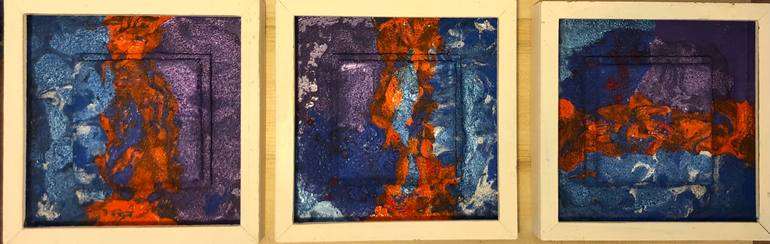 Watching the sea and the sky mixing at the sunset, a love adventure among colors, but only last for a moment, after that view just darkness. Size:10 x 10 each (3 Paintings) (30 x 10) Beach sand, ocean water, pebbles, acrylic, canvas o a wood box. Painted on the beach. Falmouth, MA December 2021...