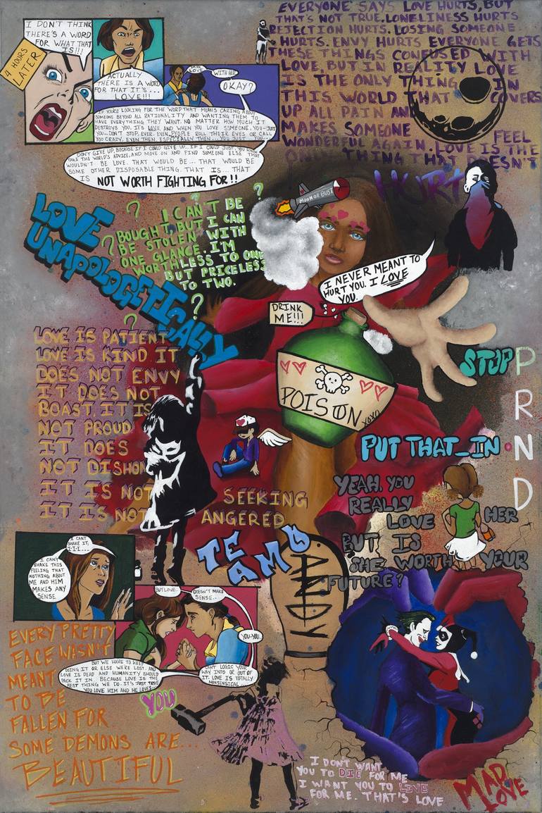 Part of the "Pillars of Human Nature" Graffiti series, Love is what we pray for. There are so many versions of what we think love should be and look like. This piece tells a story of falling into or out of love.