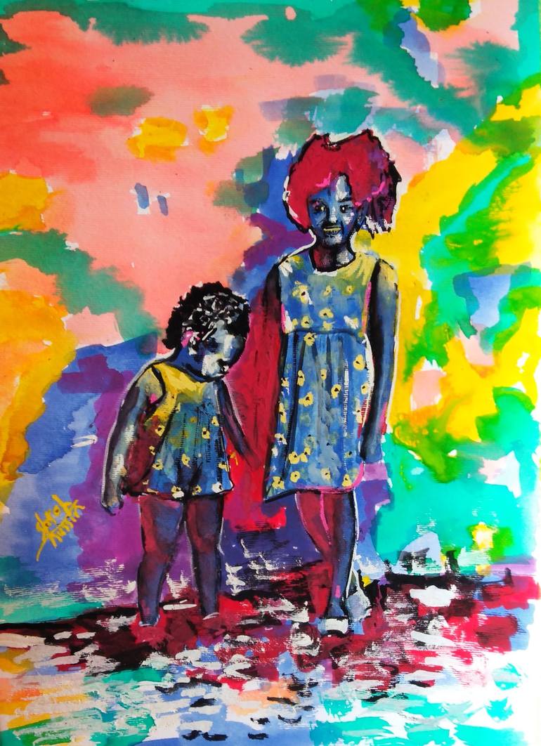 It's a painting of two sisters , in watercolor and gouache colours on paper