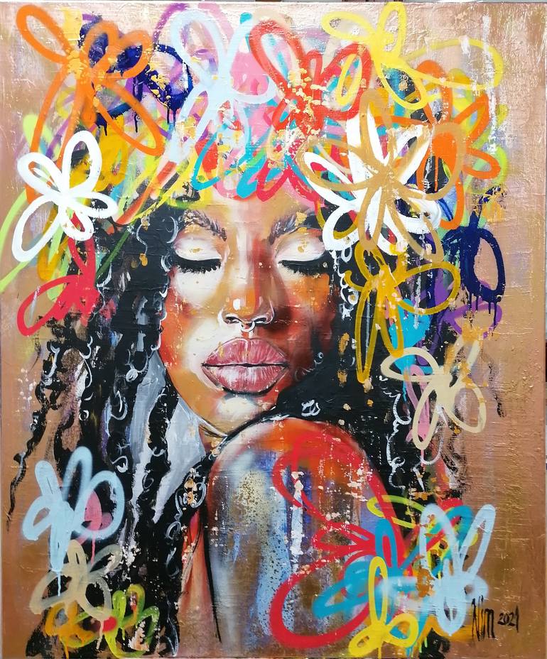 KaNim is a German painter with Turkish roots. Her art stands out for her female protagonists. Sometimes abstract, sometimes realistic - but always bold and colorful. She represents the conviction that colours are essential to moods. Her portraits represents fierce, strength,pride and freedom. She is addicted with flowers and adds them with naive representations to her portraits.