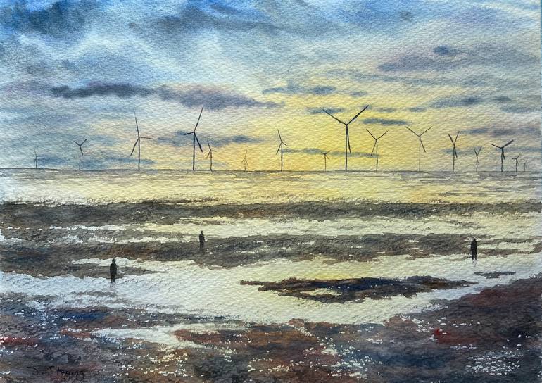 Watercolour of Crosby beach and the iron men sculptures at low tide
