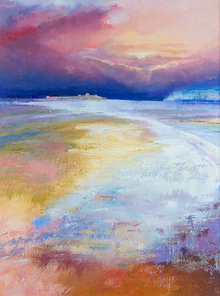 Living on an island you experience some extraordinary weather, the light can be so captivating and surreal. Seeing the sunset light reflected over the wet sand was just too inspiring not to paint.
