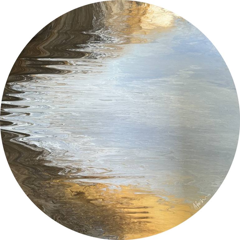 This was inspired by the amazing golden shallow water exposed at Brunswick River in New South Wales, Australia, at low tide. There is extreme detail on this painting which required the viewer to take a close look. NOTE: This is a circular panel designed to 'float' on the wall and comes with a hid...