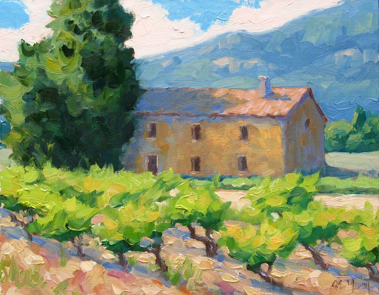 This painting was inspired by a painting trip I took to southern France, to the Luberon valley. This is just outside of the village of Lourmarin. Throughout this region are vineyards for the wines of the Luberon and the Cotes du Rhone. I loved the way this oil farmhouse and vineyard was bathed in th...