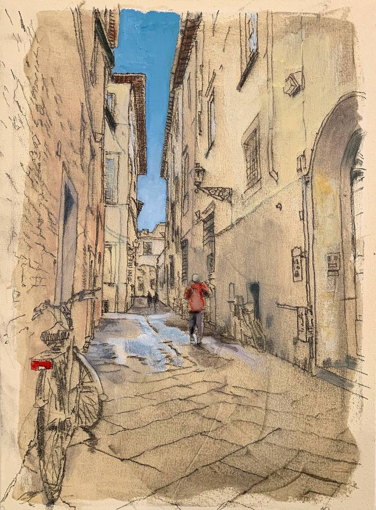 Mostly large format oil on canvas works. Many of these visual spaces are inhabited by groups, or individuals in a dialogue which originates outside of the frame, in a cinematic sense, where the still image refers to a larger narrative, happening around, before and after the image itself, creating perhaps a mystical sense of separation and disconnect. Recent recurrent themes: places of childhood, revised and revisited, with elements of Eastern faith: where a sort of spiritual “cleaning” is set in the context of water related environments. Then there is the absolute opposite space: the dessert, the apparently barren, where the sense of being in that space seems to question the sustenance and purpose of the inhabitants of that place. When more actors populate the space, an uncomfortable narrative occurs, where a relationship needs to be established, where a hierarchy is suggested, where these people meet, temporarily, in this segment of time and space, not belonging to one another of the time and space they are given.