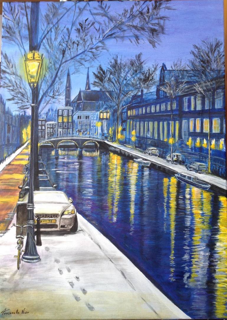Features Night lights on the river canals of Amsterdam.