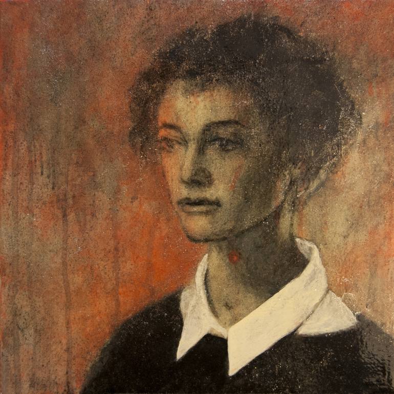 A portrait of young woman. This piece will look different with lighting position since there are a lot of layers of different materials with paints. ( including shiny paints )
