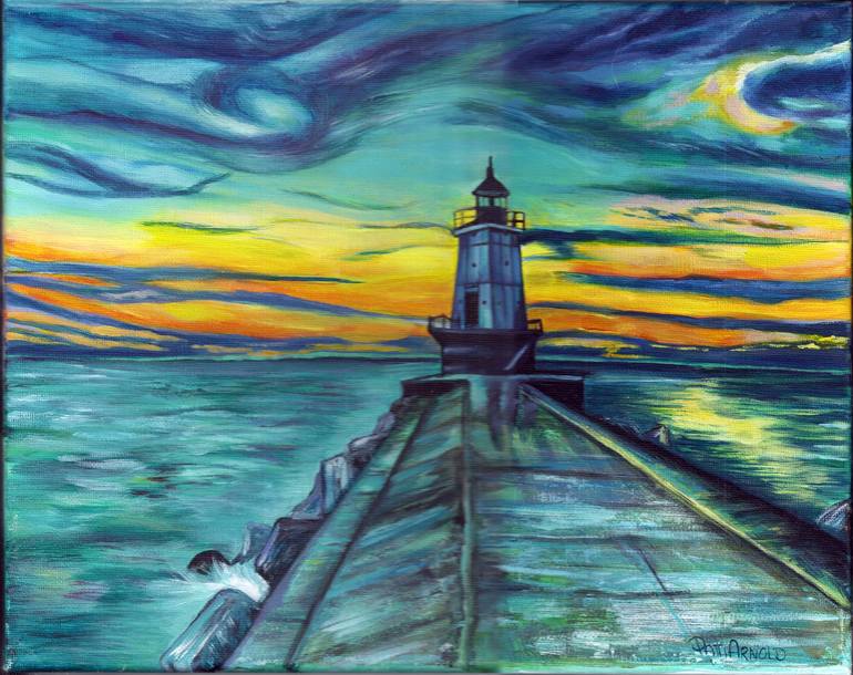 This is a 11" x 14" acrylic painting of a Lighthouse in Ludington, Michigan. This painting is a kaleidoscope of colors that will look great as a centerpiece for a lighthouse collection or as a focal point in your cabin or home.