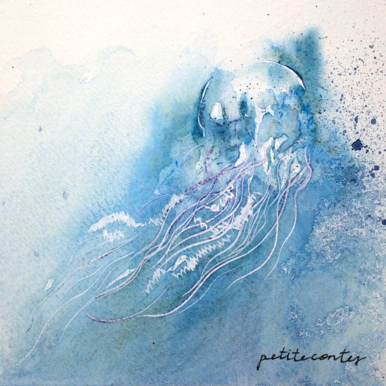 A single jellyfish glows softly in the ocean’s deep blue, with rays of sunlight filtering through its delicate, translucent form. The piece captures the captivating, dreamlike quality of this underwater wonder.