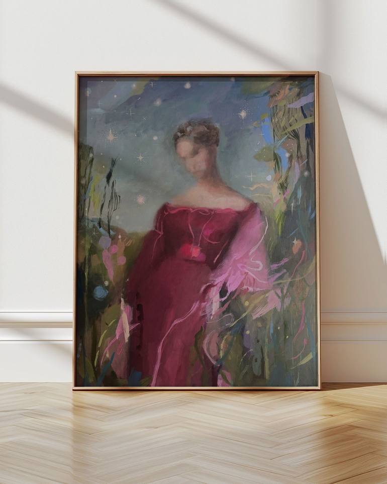 I paint embodiments of energy, symbols of feminine power. By moving beyond the physical form and merging with their surroundings, these avatars explore the relationship between the material and the magical. Inspired by "Portrait of a Young Lady in a Red Dress with a Paisley Shawl by Eduard Friedric...